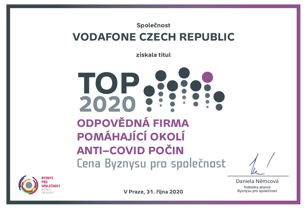 Společnost Vodafone získala ocenění za aktivitu své Nadace Vodafone v prestižním hodnocení žebříčku TOP Odpovědná firma, a to sice v subkategorii TOP Odpovědná firma pomáhající okolí – Anti-COVID počin, která byla vyhlášena výjimečně pro rok 2020. Vodafone uspěl s projektem mobilní aplikace Bright Sky pro řešení domácího násilí.